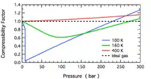 The figure on the right shows an overview covering a wide temperature range. At low temperature (100 K), the curve has a characteristic check-mark shape, the rising portion of the curve is very nearly directly proportional to pressure. At intermediate temperature (160 K), there is a smooth curve with a broad minimum; although the high pressure portion is again nearly linear, it is no longer directly proportional to pressure. Finally, at high temperature (400 K), Z is above unity at all pressures. For all curves, Z approaches the ideal gas value of unity at low pressure and exceeds that value at very high pressure.