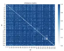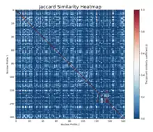 The Jaccard similarity index can be normalized, and then can be displayed using a symmetrical heat-map. Figure 1 is an example of a heat-map of the Jaccard similarity index matrix from a mouse's genome using data retrieved from the GAM method. Red represents two nuclear profiles that are similar to each other, while dark blue indicates that two nuclear profiles are very different. The heat-map is symmetric along the diagonal line. The red diagonal line indicates that two nuclear profiles are identical to each other and have a Jaccard similarity index of 1.