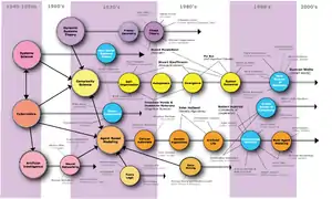 Independent from developments in computational models of social systems, social network analysis emerged in the 1970s and 1980s from advances in graph theory, statistics, and studies of social structure as a distinct analytical method and was articulated and employed by sociologists like James S. Coleman, Harrison White, Linton Freeman, J. Clyde Mitchell, Mark Granovetter, Ronald Burt, and Barry Wellman.[22] The increasing pervasiveness of computing and telecommunication technologies throughout the 1980s and 1990s demanded analytical techniques, such as network analysis and multilevel modeling, that could scale to increasingly complex and large data sets. The most recent wave of computational sociology, rather than employing simulations, uses network analysis and advanced statistical techniques to analyze large-scale computer databases of electronic proxies for behavioral data. Electronic records such as email and instant message records, hyperlinks on the World Wide Web, mobile phone usage, and discussion on Usenet allow social scientists to directly observe and analyze social behavior at multiple points in time and multiple levels of analysis without the constraints of traditional empirical methods such as interviews, participant observation, or survey instruments.[23] Continued improvements in machine learning algorithms likewise have permitted social scientists and entrepreneurs to use novel techniques to identify latent and meaningful patterns of social interaction and evolution in large electronic datasets.[24][25]