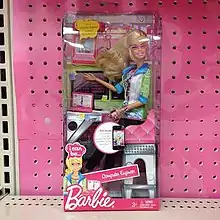 The doll has a pink laptop and a pink smartphone, and is wearing geometric pink glasses, a pink watch, black leggings, a T-shirt decorated with "Barbie" spelled in binary code, a fitted vest with saddle-stitch detailing, pink wedges, and a Bluetooth headset.[1][2] The packaging included a code to unlock exclusive game content on the Barbie website.[3] Female engineers including Betty Shanahan, CEO of the Society of Women Engineers, and Alice Agogino of the National Academy of Engineering were consulted on her wardrobe and work environment.[1][3][4][5] They suggested that for authenticity she needed "a Coke can and a bag of Doritos" on her desk; she has a coffee cup. One mockup also included a Linux penguin;[4] Barbie is running Linux on her dual-monitor set-up.[6]