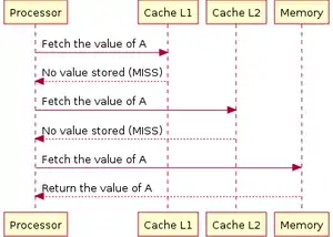 When the data is not where the processor is looking for, it is called a cache-miss. Below, pictures show how the processor fetch data when there are two cache levels.