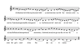 Her song A chantar m'er de so qu'eu no volria in the Occitan language is the only canso by a trobairitz to survive with its music intact.[8] The music to A chantar is found only in Le manuscript di roi, a collection of songs copied around 1270 for Charles of Anjou, the brother of Louis IX.[9]