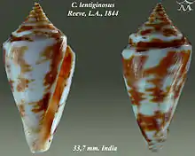 | Apertural and abapertural views of shell of Conasprella lentiginosa (Reeve, L.A., 1844) | |