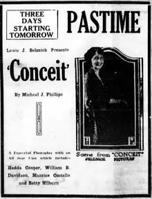 Conceit is a 1921 American silent drama film directed by Burton George, produced by Selznick Pictures, and released by Select Pictures. The film stars William B. Davidson and Mrs. De Wolf Hopper, who later became a gossip columnist using the name "Hedda Hopper".[1][2][3]