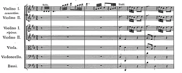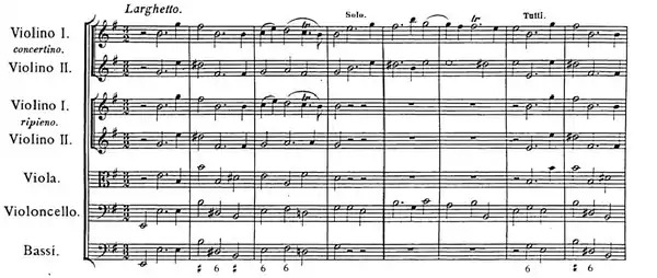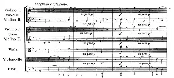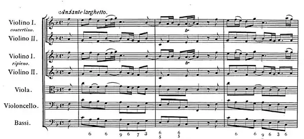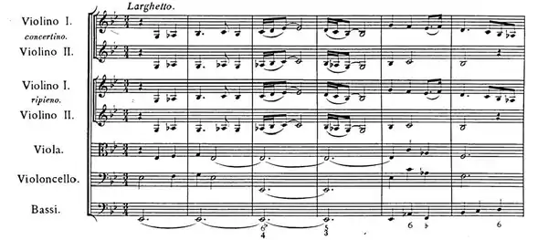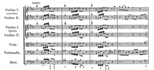 The first short movement of the concerto starts dramatically, solemn and majestic: the orchestra ascends by degrees towards a more sustained section, each step in the ascent followed by a downward sighing figure first from the full orchestra, echoed by the solo violins. This severe grandeur elicits a gentle and eloquent response from the concertino string trio, in the manner of Corelli, with imitations and passages in thirds in the violins. The orchestra and soloists continue their dialogue until in the final ten bars, there is a reprise of the introductory music, now muted and in the minor key, ending with a remarkable chromatic passage of noble simplicity descending to the final drooping cadence.