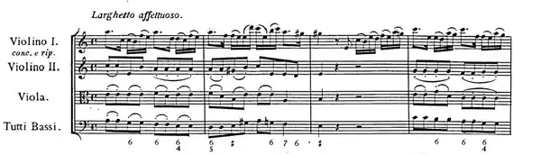 The first movement, marked larghetto affetuoso, has been described as one of Handel's finest movements, broad and solemn. The melody is played by the first violins in unison, their falling appoggiatura semiquavers reflecting the galant style. Beneath them, the bass part moves steadily in quavers, with extra harmony provided by the inner parts.