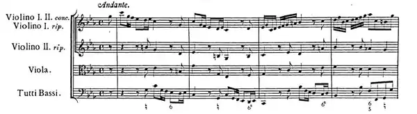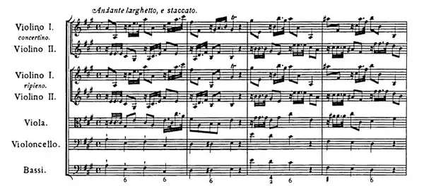 ... the Symphony, or introduction, of the andante is extremely pleasing; and no less remarkable for its grace, than the boldness with which the composer, in order to bring in the answers to points of imitation, has used double discords, unprepared. The Solo parts of this movement were thought more brilliant, than easy and natural to the bow and finger-board, forty-years ago.