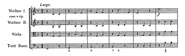 The largo e piano in F major is one of Handel's most sublime and simple slow movements, a sarabande in the Italian trio sonata style. Above a steady crotchet walking bass, the sustained theme is gently exchanged between the two violin parts, with imitations and suspensions; harmonic colour is added in the discreet viola part. In the closing bars the crotchet figure of the bass passes into the upper strings before the final cadence.