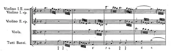 The first movement, in the style of a French overture with dotted rhythms and scale passages, for dramatic effect has the novel feature of being prefaced by a two bar passage for the first concertino violin.