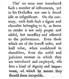 If the epithet grand, instead of implying, as it usually does, many parts, or a Concerto requiring a great band or Orchestra, had been here intended to express sublimity and dignity, it might have been used with the utmost propriety; for I can recollect no movement that is more lofty and noble than this; or in which the treble and the base of the tutti, or full parts, are of such distinct and marked characters; both bold, and contrasted, not only with each other, but with the solo parts, which are graceful and chantant. Nor did I ever know such business done in so short a time; that movement contains but thirty-four bars, and yet nothing seems left unsaid; and though it begins with so much pride and haughtiness, it melts at last into softness; and, where it modulates into a minor key, seems to express fatigue, languor and fainting.