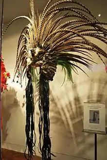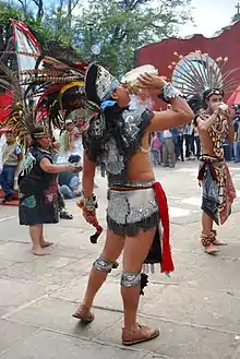 The most traditional Conchero dances wear tunics called naguillas (little skirt) and often a cape. These dancers will also have large quantities of gold and silver colored adornments and headdresses made of dyed ostrich feathers.[1][5] Azteca or Mexica costumes tend to not wear tunics, instead try to copy Aztec dress as depicted in Mesoamerican codices, sometimes with elements of North American Indian dress. Headdresses tend to be made with pheasant feathers.[2][4] The two styles of dress are not completely separate, especially in Mexico, where Azteca dress has influenced that of the more traditional Concheros, and vice versa.[5]