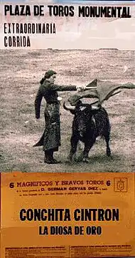 Concepción Cintrón Verrill, also known as Conchita Cintrón or La Diosa de Oro ('The Golden Goddess') [1] (August 9, 1922 in Antofagasta – February 17, 2009 in Lisbon), was a Chile-born Peruvian torera (female bullfighter), perhaps the most famous in the history of bullfighting. In the ring Cintrón was said to display particular grace, style and bravado, a combination known as duende.