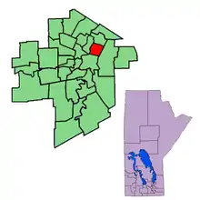 It is bordered to the south by St. Boniface, to the west by Elmwood, to the north by Rossmere, and to the east by Radisson. The riding was created by redistribution in 1979, and formally came into existence with the provincial election of 1981.