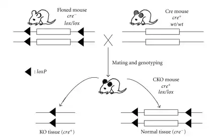 Conditional gene knockout is a technique used to eliminate a specific gene in a certain tissue, such as the liver.[1][2] This technique is useful to study the role of individual genes in living organisms. It differs from traditional gene knockout because it targets specific genes at specific times rather than being deleted from beginning of life. Using the conditional gene knockout technique eliminates many of the side effects from traditional gene knockout. In traditional gene knockout, embryonic death from a gene mutation can occur, and this prevents scientists from studying the gene in adults. Some tissues cannot be studied properly in isolation, so the gene must be inactive in a certain tissue while remaining active in others. With this technology, scientists are able to knockout genes at a specific stage in development and study how the knockout of a gene in one tissue affects the same gene in other tissues.[3][4]