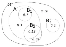 Illustration of conditional probabilities with an Euler diagram. The unconditional probability P(A) = 0.30 + 0.10 + 0.12 = 0.52. However, the conditional probability P(A|B1) = 1, P(A|B2) = 0.12 ÷ (0.12 + 0.04) = 0.75, and P(A|B3) = 0.