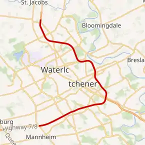 | 5.5 | 3.4 | Regional Road 28 (Homer Watson Boulevard) Regional Road 4 (Ottawa Street) | |||