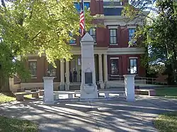Mayfield during the Civil War was very supportive of the Confederate States of America. Representatives from seven western Kentucky counties and twenty western Tennessee counties met at Mayfield in May 1861 to discuss forming a new state that would join the Confederacy. The secession of Tennessee on June 8, 1861 caused the proposal to be abandoned,[3] In 1864 Union forces occupied the town and forced the townspeople to help fortify the courthouse, which was destroyed later that year. The courthouse behind the memorial fountain was built in 1889.[2]