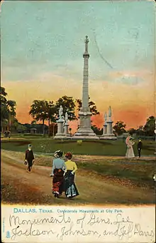 The monument was designed by Frank Teich, who in 1896 was made an honorary member of Dallas Chapter, No. 6 of the United Daughters of the Confederacy (UDC).[9] The cornerstone was dedicated by the UDC Dallas chapter on June 25, 1896.[10] The dedication of the monument on April 29, 1897[11] was attended by thousands, with hundreds of Confederate veterans, including Colonel William Lyne Crawford[10] and Texas governor Charles Allen Culberson.[12] There were also Masons, Knights Templar, Free Thinkers and German Turners.[10] The Galveston Daily noted that a black woman threw granite at a carriage on the way, but she was dismissed as "insane."[10]