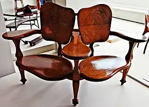 By the time he was designing furniture for Casa Calvet (1898-1899), Gaudí was creating "fluid and abstract" designs that would bring out the grain, texture, and color of the wood[15] but also produce "clarity of structure and cleanliness of construction."[12] Constructed of oak in the Casas i Bardés workshops, the pieces— including chairs, benches, a table, a desk, a stool, and a mirror with a gilded frame— display Gaudí's move towards fluid, organic designs while still retaining somewhat traditional elements. However, the armchair he designed for the office, though containing ornamental flourishes and featuring a distinctive heart-shaped seat back and a round seat, breaks away from tradition, lacking a single straight line.[16] An example of "free-form" furniture, the chair was designed to "cradle the human body," and its lines are reminiscent of Art Nouveau furniture without being strictly classified as Art Nouveau.[17] Soon, Gaudí would strip away remaining elements of "superfluous ornamentation" in favor of simple "comfort and utility."[3] From this point on, his furniture designs feature "solid forms and simple profiles," sometimes suggesting the simple lines of medieval furniture design while still containing his trademark "sinuous and zigzagging lines."[18]