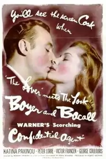 Confidential Agent is a 1945 American spy film starring Charles Boyer and Lauren Bacall which was a Warner Brothers production.[1][2] The movie was directed by Herman Shumlin and produced by Robert Buckner with Jack L. Warner as executive producer. The screenplay was by Robert Buckner, based on the 1939 novel The Confidential Agent by Graham Greene. The music score was by Franz Waxman and the cinematography by James Wong Howe. The supporting cast includes George Coulouris and Peter Lorre.