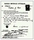 Much of the money deposits into banks and other financial institutions have also been subsequently seized in the immediate aftermath of the deportations. Once a deposit was made, a certificate was given to the depositor as a proof of deposit. However, once the deportations began, withdrawals were prohibited. Much of the deportees who had held deposits were left with only certificates in their possession. Many of the depositors still carry the certificates of deposit today. Historian Kevork Baghdjian states that the worth of these deposits "should rise to astronomical sums today," with the "deposited capital and interests combined."[50]