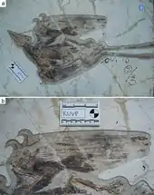 Many specimens of Confuciusornis preserve a single pair of long, streamer-like tail feathers, similar to those present in some modern birds-of-paradise.[48] Specimens lacking these feathers include ones that otherwise have exquisitely preserved feathers on the rest of the body, indicating that their absence is not simply due to poor preservation.[7] Larry Martin and colleagues stated in 1998 that long tail feathers are present in about 5 to 10% of the specimens known at the time.[25] A 2011 analysis by Jesús Marugán-Lobón and colleagues found that out of 130 specimens, 18% had long tail feathers and 28% had not, while in the remaining 54% preservation was insufficient to determine their presence or absence.[18] The biological meaning of this pattern has been discussed controversially.[18] Martin and colleagues suggested that the pattern might reflect sexual dimorphism, with the streamer-like feathers only present in one sex (likely the males) which used them in courtship displays.[25] This interpretation was followed by the majority of subsequent studies.[49] Chiappe and colleagues, in 1999, argued that sexual dimorphism is not the only but the most reasonable explanation, noting that in modern birds the length of ornamental feathers often varies between the sexes.[7]