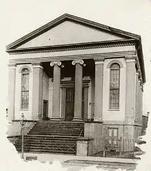 The congregation had outgrown the Musical Association Hall almost as soon as they moved into it. On March 11, 1853 they dedicated their Jackson Street Synagogue. The building had been built as a Unitarian church in 1846. Baruch Emanuel gave up leading the congregation in early 1853, before services had been held in the new building. Julius Eckman was appointed as the new rabbi but quickly fell into disfavor. He was succeeded by Dr. Isaac Schatz. The congregation suffered a catastrophe on December 11, 1856 when the new synagogue burned down. A stove in the basement caught the wooden building on fire. The congregation turned to selling subscriptions in order to rebuild on the same site. Several non-Jews contributed to the rebuilding, among them Dr. Josiah C. Nott and N. St. John. A month after the disaster the congregation published a thank you notice in the Mobile Daily Register to "our fellow citizens of Mobile" for their assistance after the fire. By the end of March 1857 the members had collected $3,555 in donations and on June 2, 1857 the congregation broke ground for a new synagogue. The new building would be stuccoed brick in the Greek Revival style with Ionic columns.[3]