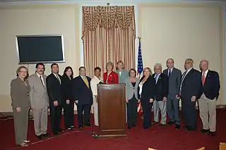 The Congressional LGBTQ+ Equality Caucus was formed by openly gay representatives Tammy Baldwin and Barney Frank June 4, 2008, to advance LGBT+ rights.[1][2] The caucus had 165 members (164 Democrats and one Republican, Jeff Van Drew) in the 116th United States Congress. The caucus is co-chaired by the United States House of Representatives' nine openly LGBTQ members: Representatives David Cicilline, Angie Craig, Sharice Davids, Mondaire Jones, Sean Patrick Maloney, Chris Pappas, Mark Pocan, Mark Takano, and Ritchie Torres.[3]