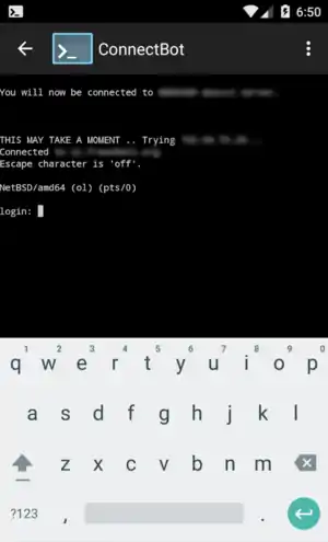 ConnectBot is an open-source Secure Shell client for the Android operating system. It lets users securely log in remotely to servers that run a secure shell daemon. This allows the user to enter commands from their Android device and have the commands run on the remote server instead of the local android device. It uses the standard encryption used by SSH2 to keep any commands and data that are transmitted from being eavesdropped by any potential listeners across the network.