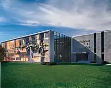 In 1950, Bernard O. Gruneke, then art director of Conrad Schmitt Studios, was one of the first American artists to experiment with the dalle de verre technique of producing stained glass (also known as "slab glass" or "faceted glass").[5] Gruenke was inspired while traveling in France during the 1940s, and is credited with what may be the first dalle de verre window created in the United States.[6] Experiments with epoxy and support structure at Conrad Schmitt Studios led to the first large-scale installations of faceted glass in the country, including a chapel at Notre Dame University's Moreau Seminary in South Bend, Indiana in 1959.[7]