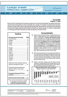 Consensus Economics publishes Consensus Forecasts, a widely cited monthly compilation of macroeconomic forecasts and topical analyses by country for 115 economies.[1][2] The countries covered include member countries of the G-7 industrialized nations, Asia Pacific, Eastern Europe, and Latin America.[2] It also has more specialized publications such as the Foreign Exchange forecasts and Energy & Metals Consensus Forecasts.[2] Each publication is distributed in hard-copy format and via email as PDF files and Excel spreadsheets.[2] Once a year the company releases The Consensus Forecasts Global Outlook at the start of November, which covers long-term forecasts for countries in Western and Eastern Europe, North and South America and the Asia Pacific.