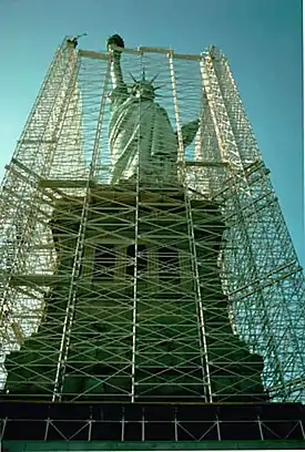 From November 7, 1982, public announcements were made by project officials that the Statue of Liberty would be completely closed to the public for as long as one year beginning in 1984.[7] The statue had been closed only once before for such an extended period of time, and that was at one point in the late 1930s. Later announcements stated that the erection of the scaffolding surrounding the outside of the statue would begin in the fall of 1983, and it was still believed in July 1983 that the restoration would begin sometime in the fall.[8] NPS representatives retracted and revised the earlier announcement concerning the closure of the Island to the public; Liberty Island would in fact remain open and closings would be intermittent and only for several days at a time at most.[8] The restoration would not begin until January 23, 1984. An article from The New York Times published the day after, indicated that the 30-month project had officially begun the day before, and that visitors would have approximately two weeks remaining before the statue would be completely enshrouded by the tons of extruded aluminum scaffolding that had just been deposited on Liberty Island.[9]