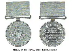 The Constabulary Medal was a decoration of the Royal Irish Constabulary (RIC). The medal was established on 15 April 1842, by the Inspector General of the Royal Irish Constabulary and approved by the Lord Lieutenant of Ireland.[3] Though it was not formally created by the crown, but was a local award with viceregal approval, it was presented for eighty years and is found in the government's official order of wear.[2]