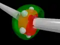 The Thompson constant velocity joint [15] (TCVJ), also known as a Thompson coupling, assembles two cardan joints within each other to eliminate the intermediate shaft. A control yoke is added to keep the input and output shafts aligned. The control yoke uses a spherical pantograph scissor mechanism to bisect the angle between the input and output shafts and to maintain the joints at a relative phase angle of zero. The alignment ensures constant angular velocity at all joint angles. Eliminating the intermediate shaft and keeping the input shafts aligned in the homokinetic plane greatly reduces the induced shear stresses and vibration inherent in double cardan shafts.[16][17][18] While the geometric configuration does not maintain constant velocity for the control yoke that aligns the cardan joints, the control yoke has minimal inertia and generates little vibration. Continuous use of a standard Thompson coupling at a straight-through, zero-degree angle will cause excessive wear and damage to the joint; a minimum offset of 2 degrees between the input and output shafts is needed to reduce control yoke wear.[19] Modifying the input and output yokes so that they are not precisely normal to their respective shafts can alter or eliminate the "disallowed" angles.[20]