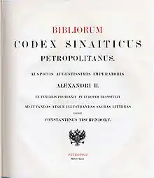 Tischendorf persuaded the monks to present the manuscript to Tsar Alexander II of Russia, at the cost of the Tsar it was published in 1862 (in four folio volumes). Those ignorant of the details of his discovery of the Codex Sinaiticus accused Tischendorf of buying manuscripts from ignorant monastery librarians at low prices. Indeed, he was never rich, but he staunchly defended the rights of the monks at Saint Catherine's Monastery when he persuaded them eventually to send the manuscript to the Tsar. This took approximately 10 years because the abbot of St Catherines had to be re-elected and confirmed in office in Cairo and in Jerusalem, and during those 10 years no one in the monastery had the authority to hand over any documents. However the documents were handed over in due course following a signed and sealed letter to the Tsar Alexander II (Schenkungsurkunde). Even so, the monks of Mt. Sinai still display a receipt-letter from Tischendorf promising to return the manuscript to them in the case that the donation can not be done. This token-letter had to be destroyed, following the late issue of a "Schenkungsurkunde". This donation act regulated the Codex exchange with the Tsar, against 9000 Rubels and Rumanian estate protection. The Tsar was seen as the protector of Greek-Orthodox Christians. Thought lost since the Russian revolution, the document (Schenkungsurkunde) has now resurfaced in St Petersburg 2003, and has also been long before commented upon by other scholars like Kurt Aland. The monastery has disputed the existence of the gift certificate (Schenkungsurkunde) since the British Library was named as the new owner of the Codex. Now following the late find of the gift certificate by the National Russian Library the existence cannot be disputed in earnest.[10] In 1869 the Tsar awarded Tischendorf the style of "von" Tischendorf as a Russian noble. 327 facsimile editions of the Codex were printed in Leipzig for the Tsar (instead of a salary for the three-year work of Tischendorf the Tsar gave him 100 copies for reselling) in order to celebrate the 1000th anniversary of the traditional foundation of the Rus' state in 862 with the publication of this most amazing find. Supporting the production of the facsimile, all made with special print characters for each of the 4 scribes of the Codex Sinaiticus, was shift work and contributed to Tischendorf's early demise due to exhausting work for months also during nights. Thus the Codex found its way to the Imperial Library at St. Petersburg.[10]