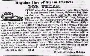 Auld did not take Constitution up Buffalo Bayou again. Instead, he offered monthly packet service between Galveston and New Orleans. He ran it aground in January 1838 near Sabine Pass, Texas, though the steamer limped into Galveston for repairs.[2] Francis Cynric Sheridan remarked in his journal that a steamer named Constitution was used for lightering freight and passengers from his brig, passing through shallow waters to gain access to Galveston Island.[4]