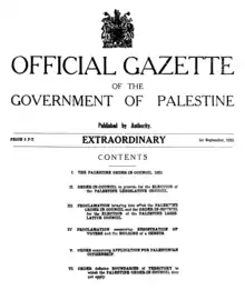 The Constitution of Mandatory Palestine, formally known as the 10 August 1922 Palestine Order-in-Council, was the codified constitution of Mandatory Palestine. It was first published on 1 September 1922 in an Extraordinary Issue of the Palestine Gazette.[2]
