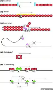 Constitutive heterochromatin was thought to be relatively devoid of genes, but researchers have found more than 450 genes in the heterochromatic DNA of Drosophila melanogaster.[5] These regions are highly condensed and epigenetically modified to prevent transcription. For the genes to be transcribed, they must have a mechanism to overcome the silencing that occurs in the rest of the heterochromatin. There are many proposed models for how the genes in these regions are expressed, including the insulation, denial, integration, exploitation, and TE restraining models.