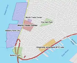 The new site constituted a mostly trapezoidal plot of land, with an extension on the north that resembled a "cork".[35] The bulk of the land was a twelve-block area bounded by Vesey, Church, Liberty, and West Streets on the north, east, south, and west, respectively.[35][36] All of these blocks would be combined to form the superblock upon which the World Trade Center was built.[36] The "cork" was a smaller trapezoid bounded clockwise from the north by Barclay Street, West Broadway, Vesey Street, and Washington Street. This would become the site of 7 World Trade Center, although that building was not added until much later. The two blocks to the west and east of the "cork" were occupied by the New York Telephone Company Building and the Federal Building, respectively.[35]