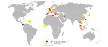 Most ships are removed from the fleet through a process known as scrapping.[59] Scrapping is rare for ships under 18 years old and common for those over 40 years in age.[60] Ship-owners and buyers negotiate scrap prices based on factors such as the ship's empty weight (called light ton displacement or LTD) and prices in the scrap metal market.[61] Scrapping rates are volatile, the price per light ton displacement has swung from a high of $650 per LTD in mid-2008 to $200 per LTD in early 2009, before building to $400 per LTD in March 2010.[62] As of 2009, over 96% of the world's scrapping activity takes place in China, India, Bangladesh, and Pakistan.[63]