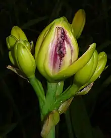 | Damage to the bud of a Hemerocallis flower from larvae of C. quinquenotata | |