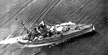 On the night of 11 November 1940, Conte di Cavour and Giulio Cesare were at anchor in Taranto harbor when they were attacked by 21 Fairey Swordfish torpedo bombers from the British aircraft carrier HMS Illustrious, along with several other warships. One torpedo exploded underneath 'B' turret at 23:15, and her captain requested tugboats to help ground the ship on a nearby 12-meter (39 ft) sandbank. His admiral vetoed the request until it was too late and Conte di Cavour had to use a deeper, 17-meter (56 ft), sandbank at 04:30 on 12 November. In an effort to lighten the ship, her guns and parts of her superstructure were removed and Conte di Cavour was refloated on 9 June 1941. Temporary repairs to enable the ship to reach Trieste for permanent repairs took until 22 December. Her guns were operable by September 1942, but replacing her entire electrical system took longer and she was still under repair when Italy surrendered a year later.[44] The Regia Marina made plans to replace her secondary and anti-aircraft weapons with a dozen 135-millimeter (5.3 in) dual-purpose guns in twin mounts, twelve 64-caliber 65-millimeter (2.6 in), and twenty-three 65-caliber 20 mm AA guns.[29] Her hulk was damaged in an air raid and capsized on 23 February 1945. Refloated shortly after the end of the war, Conte di Cavour was scrapped in 1946.[45]