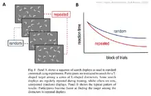 In psychology, contextual cueing refers to a form of visual search facilitation which describe targets appearing in repeated configurations are detected more quickly. The contextual cueing effect is a learning phenomenon where repeated exposure to a specific arrangement of target and distractor items leads to progressively more efficient search.[1]