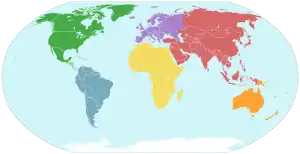 John C. Holden expanded and illustrated his own version of the idea in 1976, almost entirely as a parody in the Journal of Irreproducible Results.[2] In Holden's expansion of the concept, he satirically invents the fictional German words Sudpolarfluchtkraft ("south polar fleeing force") having created Sudpolarfluchttrofeln ("south polar fleeing drips"). He does, however, cite an actual theory of northward drift of Gondwanaland descendant continents of Australia, Africa, South America, and India breaking away from Antarctica, which he authored with Robert S. Dietz in 1970.[2][3] As part of the 1976 parody paper, he proposes that the "drips" or "sub-drips" are North America, Greenland, South America, Africa, Arabia, India, Asia, and Australia. Contrarily, "anti-drips" are formed by Ceylon and Antarctica itself because Antarctica is "on top of the world" as all the continents draw away from it.[2]