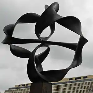 According to the artist the piece "began as an exploration of the Möbius strip, a product of pure mathematics formed by joining two ends of a strip of paper after giving one end a 180-degree twist, thus creating only one edge. The center of the bronze sculpture symbolizes a black hole, while the edge shows the flow of matter through the center from positive to negative space and back again in a continuum."[2]