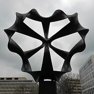 The sculpture is a large swirling abstract that consists of 8 bronze pieces painted black and placed on a pole. It moves freely.[1]