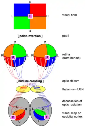 Cajal's schema of the visual map theory. O=Optic chiasm; C=Visual (and motor) cortex; M, S=Decussating pathways; R, G: Sensory nerves, motor ganglia.Transformations of the visual field toward the visual map on the primary visual cortex. U=up; D=down; L=left; R=right; F=foveaThe visual map theory was published by the famous neuroscientist and pioneer Santiago Ramón y Cajal (1898).[9] (See also [10] and [11] for English summaries.) According to this theory, the function of the optic chiasm is to repair the retinal field image on the visual cortex. The pupil in the vertebrates’ eyes inverts the image on the retina, so that the visual periphery projects to the medial side of the retina. By the chiasmatic crossing, the visual periphery is again on the outside, if one assumes that the retinal map is faithfully maintained throughout the optic tract.