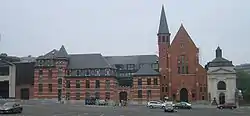 The Sisters of Perpetual Adoration, who became the Sisters of the Eucharist in 1969, were a chief Eucharistic Order founded by Anna de Meeûs, the eldest daughter of the Belgian Finance Minister and founding Chairman of the Société Générale de Belgique, Count Frederic de Meeûs. The original foundation was set up in 1844 in workshops belonging to the Church of Our Blessed Lady of the Sablon. The sisterhood rapidly outgrew its location. In 1848 the foundress' childhood friend the Baroness d'Hoogvorst (née Countess of Mercy-Argenteau) bought the building, originally the Town House of the Counts of Salazar, on Rue des Sols/Stuiversstraat from the Visiting Sisters. The Sisters took up residence in 1850, and with the original chapel soon too small, they rebuilt the neighbouring wing of the house as a modern red neo-Gothic church. The chapel was built in 1435[3] on the corner of Rue des Douze Apôtres/Twaalfapostelenstraat where Brussels' first synagogue had stood[2] until the Jews were evicted in a pogrom in 1370 – the Papal Bull establishing the Eucharistic vocation as an expiation of the Host desecration.