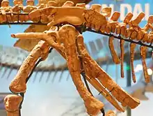 Additionally, a unique combination of traits is present that in themselves are not unique. Some of these traits are basal or symplesiomorphies. The premaxilla bears teeth. The entire upper rim of the eye socket is covered by two supraorbitals.[1] Other traits are derived characters, indicating a position higher in the evolutionary tree. The roots of the maxillary teeth are curved. The neck vertebrae are opisthocoelous, convex at the front and concave at the rear. With the sacral vertebrae the neural spines have twice the height of the vertebral body. The rear end of the ischium is expanded into a "foot". Between the fronts of the condyles of the thighbone only a shallow groove is present. The prepubic process of the pubic bone is transversely flattened.[1]