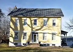 This two-story, brick Greek Revival style house was built in about 1850 by either Jonathan Cook or Henry W. Johnson. Both men were among the early Quaker settlers in this area. Johnson grew wealthy, in part, from his dealings with counterfeit money. Although the extent of his activities were not known until after his death, he was forced out of the local Quaker congregation because of it.[2] Wallace Godfrey and Clark Osburn were also involved in the counterfeiting enterprise. In 1911, it was discovered that Osburn had killed Warner Davis who had learned of the illegal activity and was going to report it.